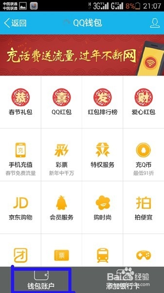 打开QQ钱包后,点击左下角的“钱包账户”,您会发现钱包内有Q币,余额和绑定的银行卡等内容。一般来说,新年抢到的红包都会在余额内。