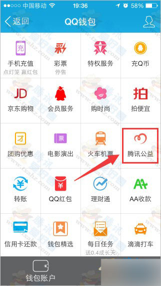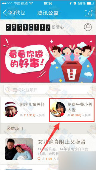 1、打开手机QQ “QQ钱包 - 腾讯公益”,点击“免费午餐小善大爱”。如下图: