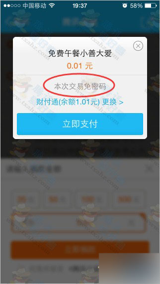 2、支付0.01元即可,因为没有银行卡和财付通,所以交易免密码。如下图: