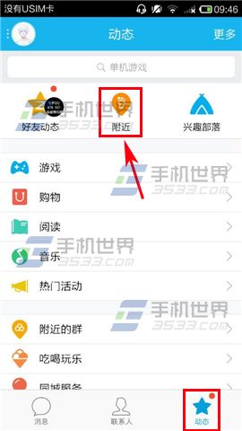 1)打开【手机QQ】,在【动态】页面点击【附近】按钮。(如下图)