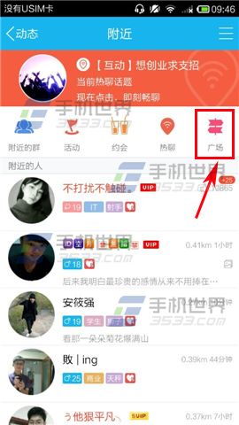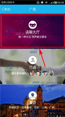 2)跳转到附近页面后,点击【广场】,选择【语聊大厅】。(如下图)
