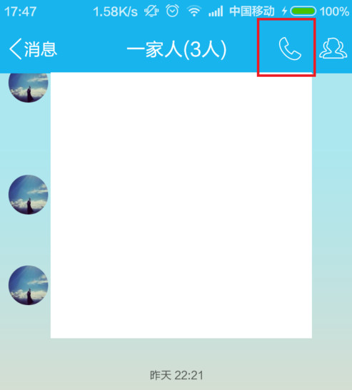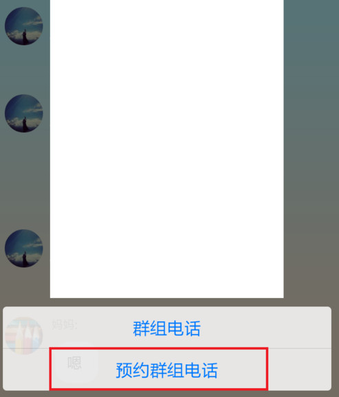 打开讨论组聊天页面以后,点击页面右上方的“电话”标志的按钮,接下来就会在页面最下方弹出菜单按钮,我们选择“预约群组电话”选项