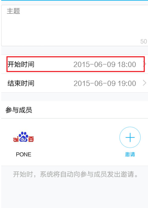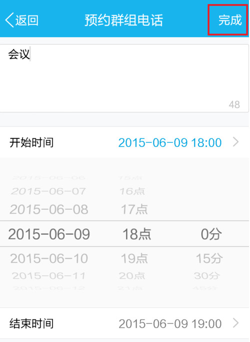 接下来,在弹出的页面中我们需要填写群组电话的预约信息,可以先填写相关主题,然后选择群组电话开始和结束时间。在选择开始时间和结束时间的时候,只需要点击待选时间选项就可以进行切换而不是滑动模式。