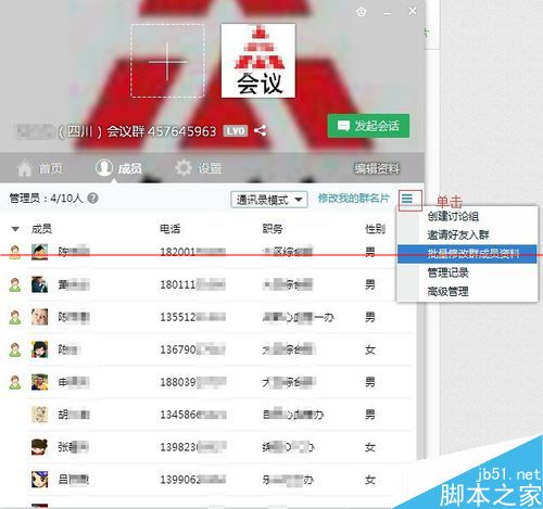 3、在弹出的窗口右上角单击,在弹出的菜单中选择“批量修改成员资料”。如图: