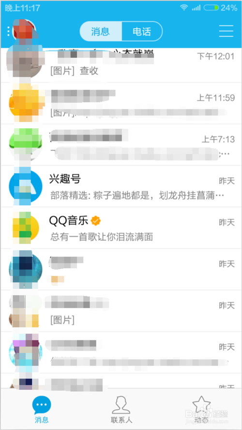 第一步,我们登陆的手机QQ,在消息这边有时候显示太多推广的广告了,这个时候我们点击动态,进入到主设计页面。