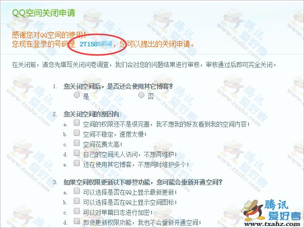 3、关闭QQ空间需要简单选择一些问题【这里注意看是否是自己需要关闭的QQ号】