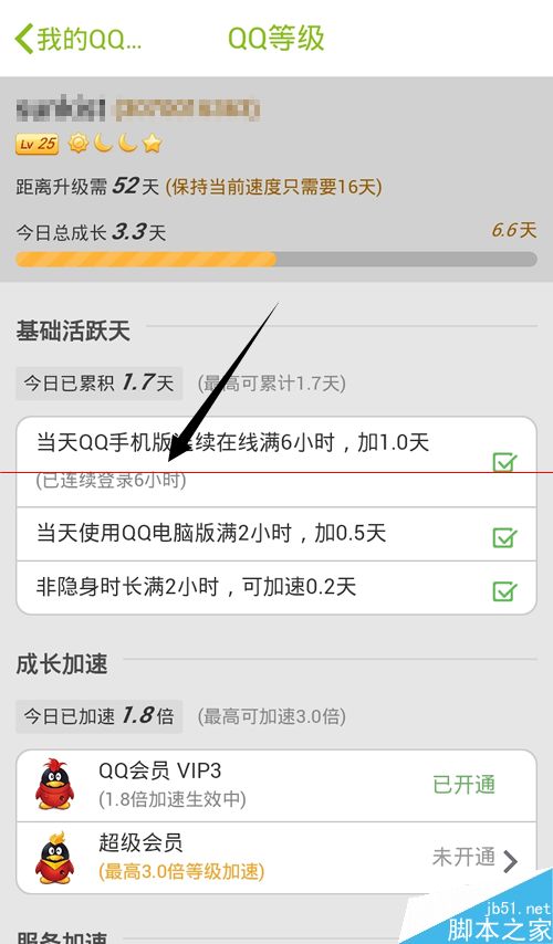 2、由于在手机上登录满了6个小时可以完成加速任务,所以在无法查看设备登录时间的时候,可以以点击QQ等级。