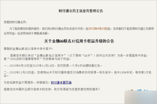 财付通会员官网发布 金穗QQ联名IC信用卡权益升级的公告,财付通会员下线成定局。之前3月份我们发过文章财付通会员主站业务暂停公告,其实那时候基本上就能断定财付通会员基本上下线了。