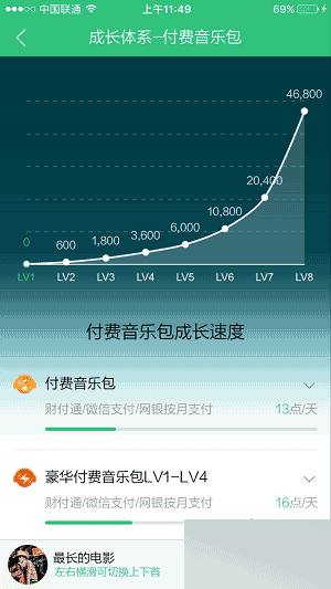 2、最高LV8级46800成长值,以及付费音乐包成长速度
