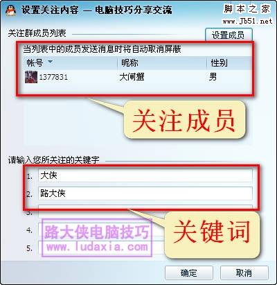 保存完成后,如果群里提到“大侠”两个字,我的QQ就会收到信息了;我关注的好友“大闸蟹”如果在群里发言说话,我也可以收到信息。