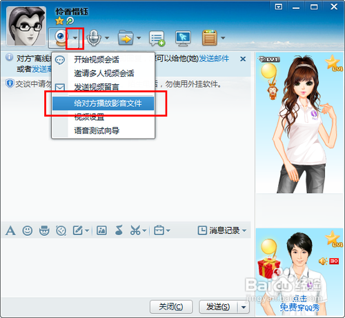2.然后点击如图所示的视频播放按钮,选择“给对方播放影音文件“选项,如图: