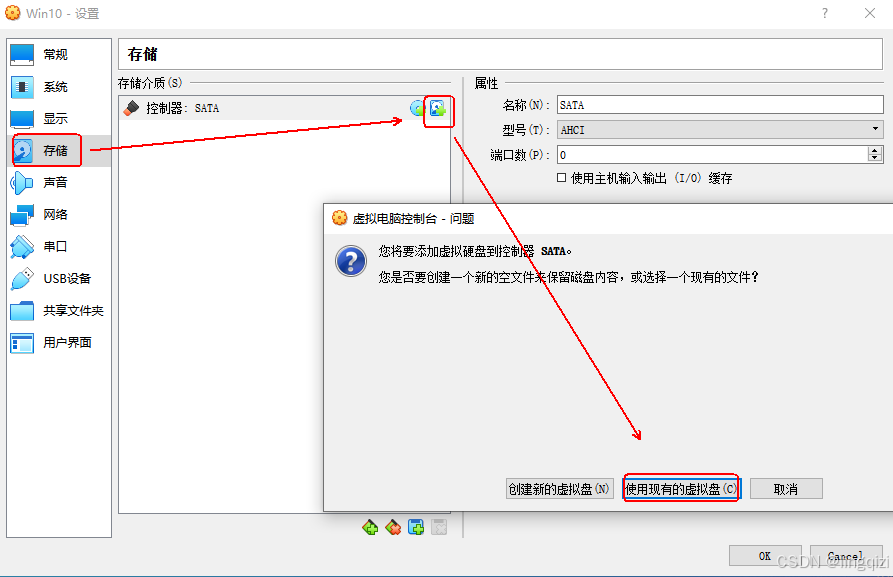 如下图,进入对应虚拟机的【设置】-【存储】,单击第二个【添加虚拟硬盘】按钮,如下图,选择【使用先用的虚拟盘】按钮