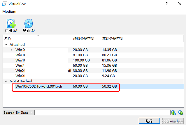 然后,选择顶部的【注册】按钮,选择对应虚拟机文件夹的vdi文件,等待系统加载完成,然后选择Not attached的vdi文件,也就是刚才添加的vdi文件。