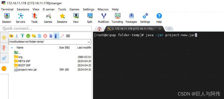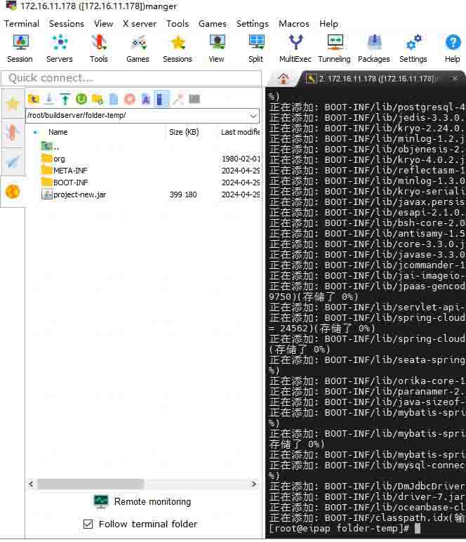 cd /root/buildserver/folder-temp/ # 把当前所有文件 压缩成 新为文件 project-new.jar jar -cvfM0 project-new.jar ./