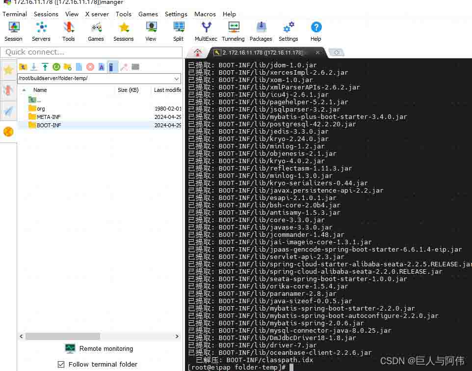 # 解压 xxx.jar 文件 jar -xvf ../xxx.jar # 执行删除或者修改文件的命令 cd /root/buildserver/folder-temp/BOOT-INF/classes/com/redxun/ rm -rf job/