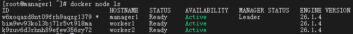 #获取worker(工作节点)令牌 [root@manager1 /]# docker swarm join-token worker #获取manager(管理节点)令牌 [root@manager1 /]# docker swarm join-token manager