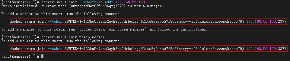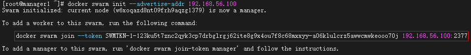 [root@manager1 /]# docker swarm init --advertise-addr 192.168.56.100