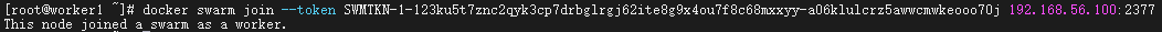 [root@worker1 ~]# docker swarm join --token SWMTKN-1-123ku5t7znc2qyk3cp7drbglrgj62ite8g9x4ou7f8c68mxxyy-a06klulcrz5awwcmwkeooo70j 192.168.56.100:2377 [root@worker2 ~]# docker swarm join --token SWMTKN-1-123ku5t7znc2qyk3cp7drbglrgj62ite8g9x4ou7f8c68mxxyy-a06klulcrz5awwcmwkeooo70j 192.168.56.100:2377