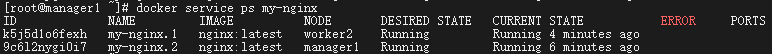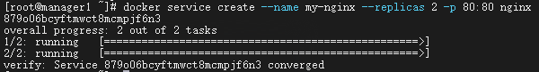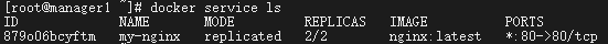 #命令会创建一个名为 my-nginx 的服务,并在集群中运行二个副本,映射到主机的80端口 [root@manager1 /]# docker service create --name my-nginx --replicas 2 -p 80:80 nginx