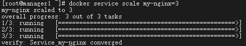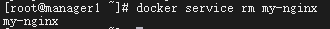 [root@manager1 /]# docker service update --image nginx:alpine my-nginx #强制更新my-nginx服务,--force 参数:强制更新服务 [root@manager1 /]# docker service update --force my-nginx