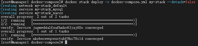 [root@manager1 /]# docker stack deploy -c docker-compose.yml my-stack --detach=false