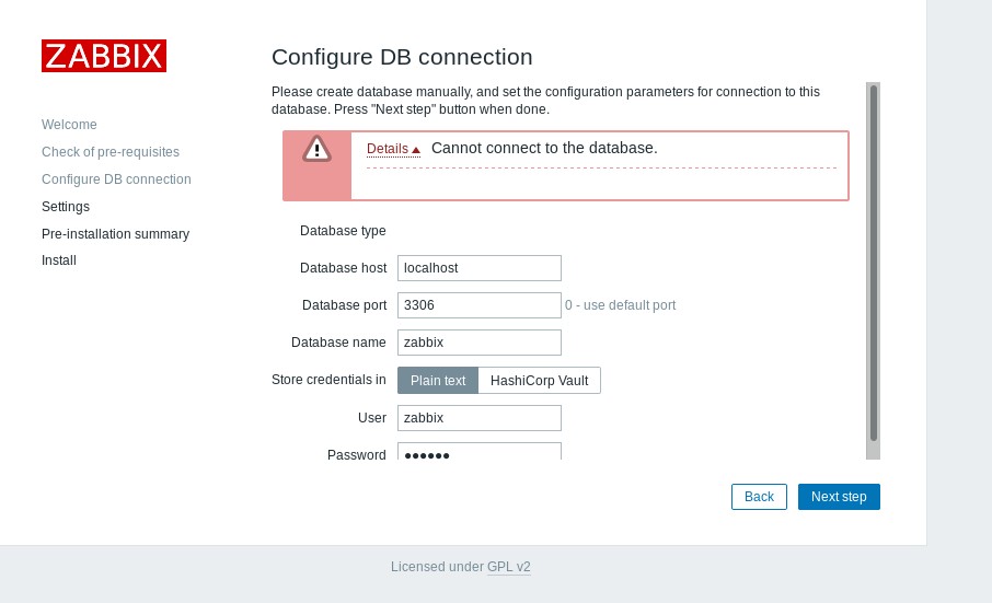 图片显示的是ZABBIX安装过程中“配置数据库连接”环节出现的问题,具体错误信息为:“Cannot connect to the database.”(无法连接到数据库)。以下是可能的原因和解决方案: