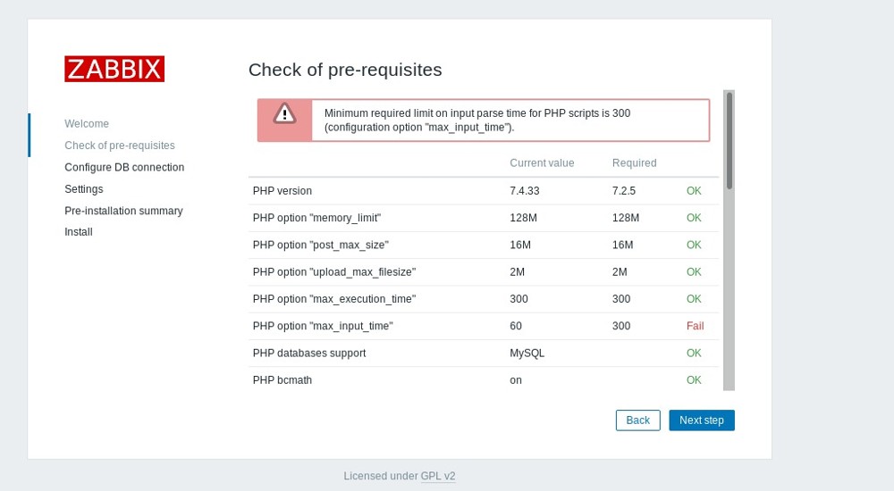 - 完成数据库创建和授权后,返回ZABBIX安装页面。