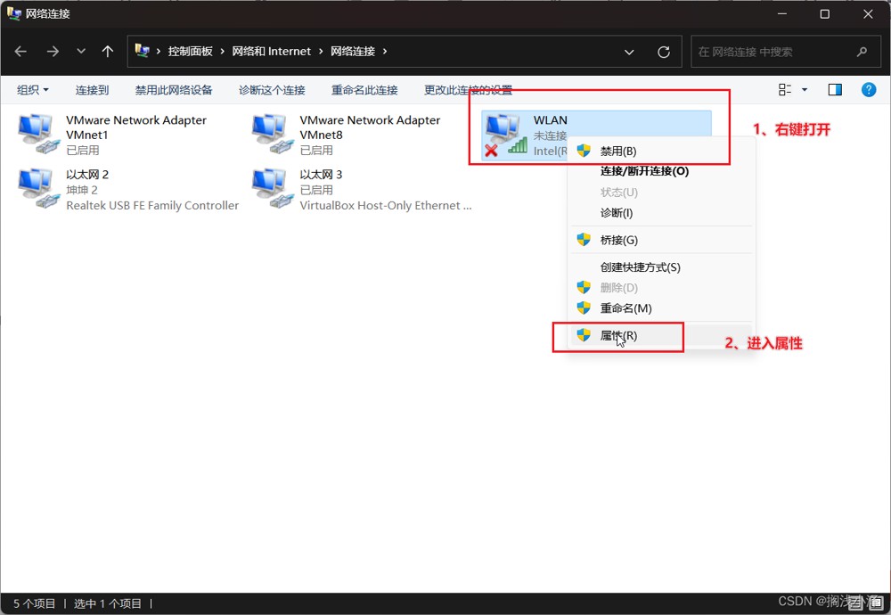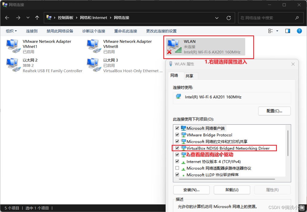 2.进入网络连接查看是否安装了网络驱动(我无法选择的原因是没有安装这个驱动)