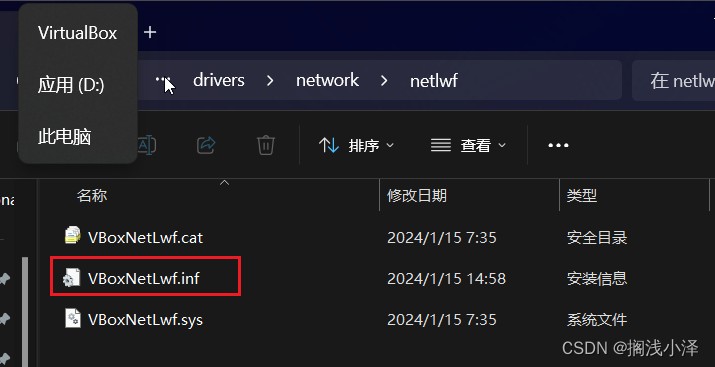 3.查看VirtualBox安装目录中,即D:\VirtulBox\drivers\network\netlwf目录下查找vboxdrv.inf文件是否存在。(依据自己安装的目录下查看)