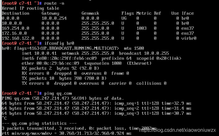 [root@ c7-41 ~]# brctl addbr br0 [root@ c7-41 ~]# brctl show bridge name bridge id STP enabled interfaces br0 8000.000000000000 no virbr0 8000.5254009a0ee3 yes virbr0-nic [root@ c7-41 ~]# brctl addif br0 ens33 #执行此步后,会导致xshell与宿主机断开连接,以下操作在宿主机完成 #删除ens33上面的IP地址,将br0上面添加上固定IP地址: #在虚拟机上执行 [root@ c7-41 ~]# ip addr del dev ens33 10.0.0.41/24 [root@ c7-41 ~]# ifconfig br0 10.0.0.41/24 up [root@ c7-41 ~]# route add default gw 10.0.0.254 [root@ c7-41 ~]# route -n [root@ c7-41 ~]# ifconfig br0 [root@ c7-41 ~]# ping qq.com