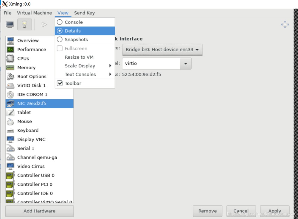 安装好Xming后,打开xshell,在连接属性的tunneing中,勾选Forwarding X11 connection to 选项,可以正常打开virt-manager的图形界面