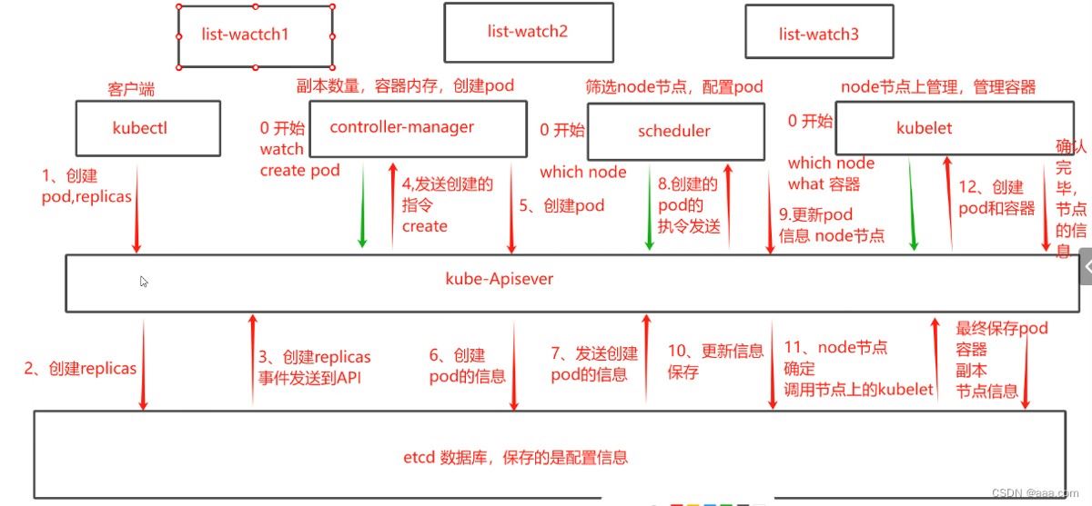 以上过程是list-watch会在每一步把监听的消息(APIserver:6443)-------controller manager,scheduler,kubelet,etcd都会监听apiserver:6443