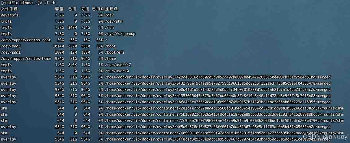 可以看到每个盘的大小,这里可以看到/dev/mapper/centos-root总大小是50G(相对其他盘小太多),之前docker给占满了,因为我后面给docker相关迁移到了home下面,所以空出很大的空间,可以看到/dev/mapper/centos-home空间总大小984G,挂载点是/home,于是我给docker相关的目录迁移到/home下了