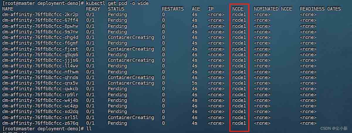 [root@master deployment-demo]# cat dm-affinity.yaml apiVersion: apps/v1 kind: Deployment metadata: name: dm-affinity spec: replicas: 5 selector: matchLabels: k8s: dolphin template: metadata: name: pod01 labels: k8s: dolphin spec: affinity: #声明亲和性 podAntiAffinity: #声明亲和性类型 requiredDuringSchedulingIgnoredDuringExecution: #硬限制,必须满足的条件有哪些(不满足下边的条件亲和性就设置失败) #设置拓扑域,指定【节点的标签名】 #【节点key】就是说,设置了拓扑域,pod就会往这个标签的节点进行创建 # 只要满足key是k8s节点的表情,那么就是同一个拓扑域 - topologyKey: k8s # 【pod标签】确定pod的表情,用于二次确认,选中了拓扑域(节点标签的key),再次选中pod标签才能确认调度到哪个节点 labelSelector: matchExpressions: #意思是是说,只要key的值是k8s的pod创建在了哪个节点,“我”就跟随他。也创建在这个节点上; - key: k8s #建议设置:in的方式进行匹配,更精准,就要设置value了 operator: Exists # Exists的方式进行匹配,这里value就不能设置了 containers: - name: c1 image: nginx ports: - containerPort: 80