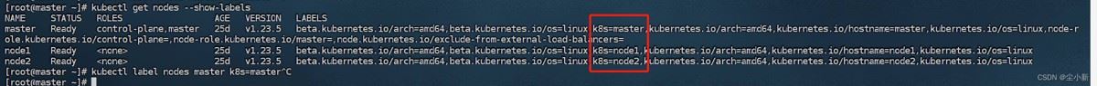 查看三个节点的标签,分别拥有k8s=master,k8s=node1,k8s=node2标签