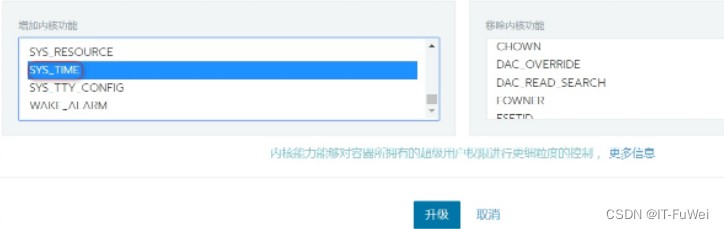 因为目前使用 rancher 进行 k8s 的管理,因此挂载的方式如下,可点击pod升级,在高级选项的最后,有增加内核的选项,选中SYS_TIME,然后点击升级即可。