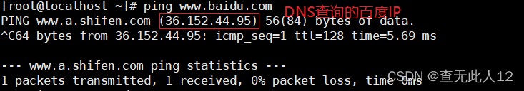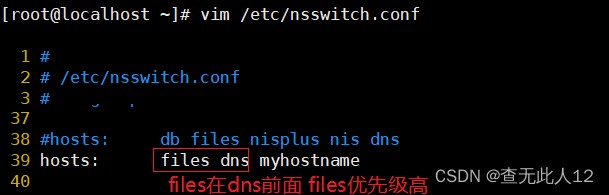 /etc/nsswitch.conf文件中在files前 查看百度的IP地址会发现百度的IP地址为dns服务器查询到的IP