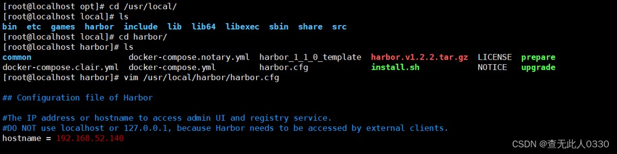 vim /usr/local/harbor/harbor.cfg --5行--修改,设置为Harbor服务器的IP地址或者域名 hostname = 192.168.52.140 --59行--指定管理员的初始密码,默认的用户名/密码是admin/Harbor12345 harbor_admin_password = Harbor12345