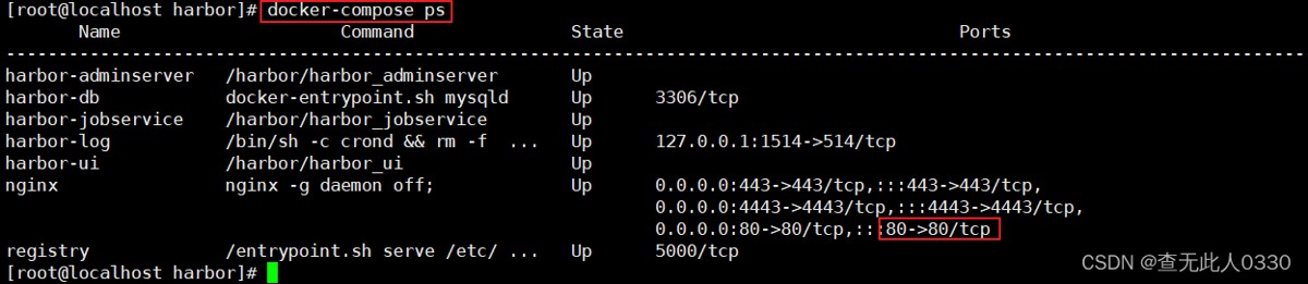 总共分为7个容器运行,通过在 docker- compose.yml 所在目录中执行 docker-compose ps命令来查看, 名称分别为:nginx、 harbor-jobservice、 harbor-ui、 harbor-db、 harbor-adminserver、registry、 harbor-log。