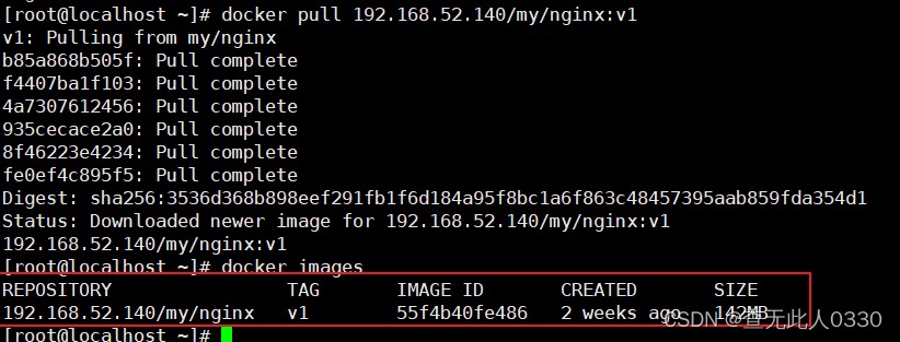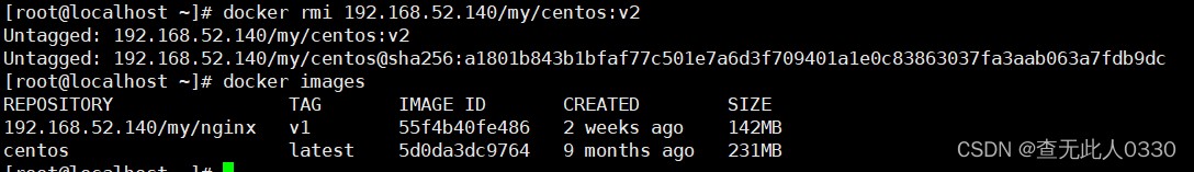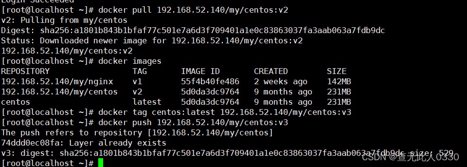 docker pull 192.168.52.140/my/centos:v2 docker tag centos:latest 192.168.52.140/my/centos:v3 docker push 192.168.52.140/my/centos:v3