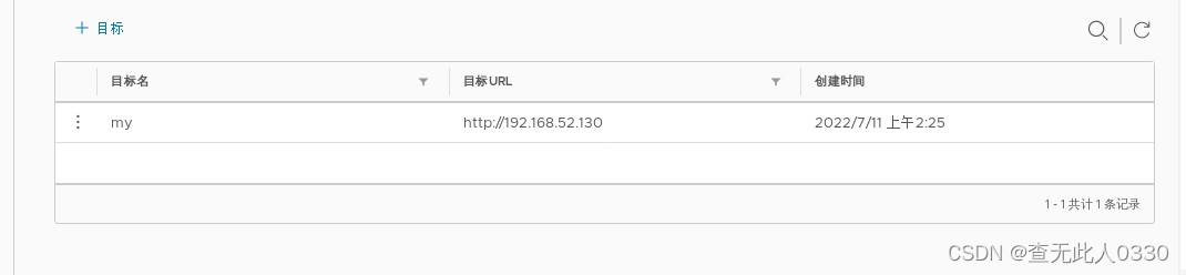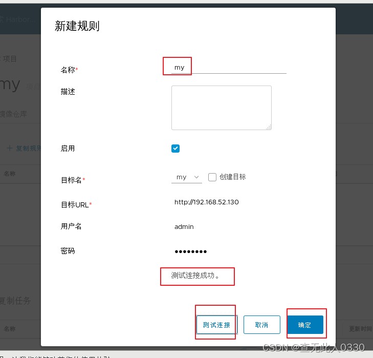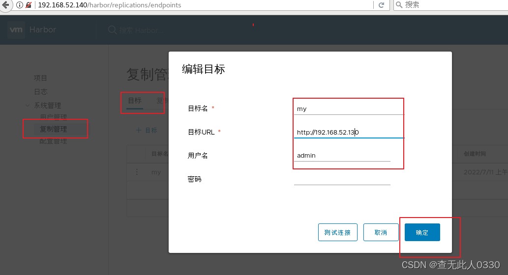 140切换用户admin-> 复制管理 -> +目标 -> 目标名称my -> 目标URLhttp://192.168.52.140 -> 用户名密码admin/Harbor12345 -> 确定