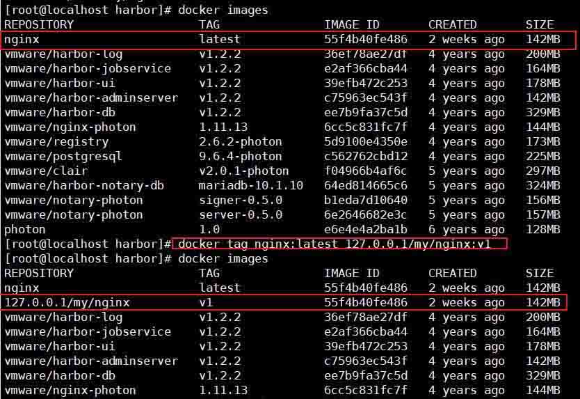 格式:docker tag 镜像:标签 仓库IP/项目名称/镜像名:标签 docker tag nginx:latest 127.0.0.1/my/nginx:v1