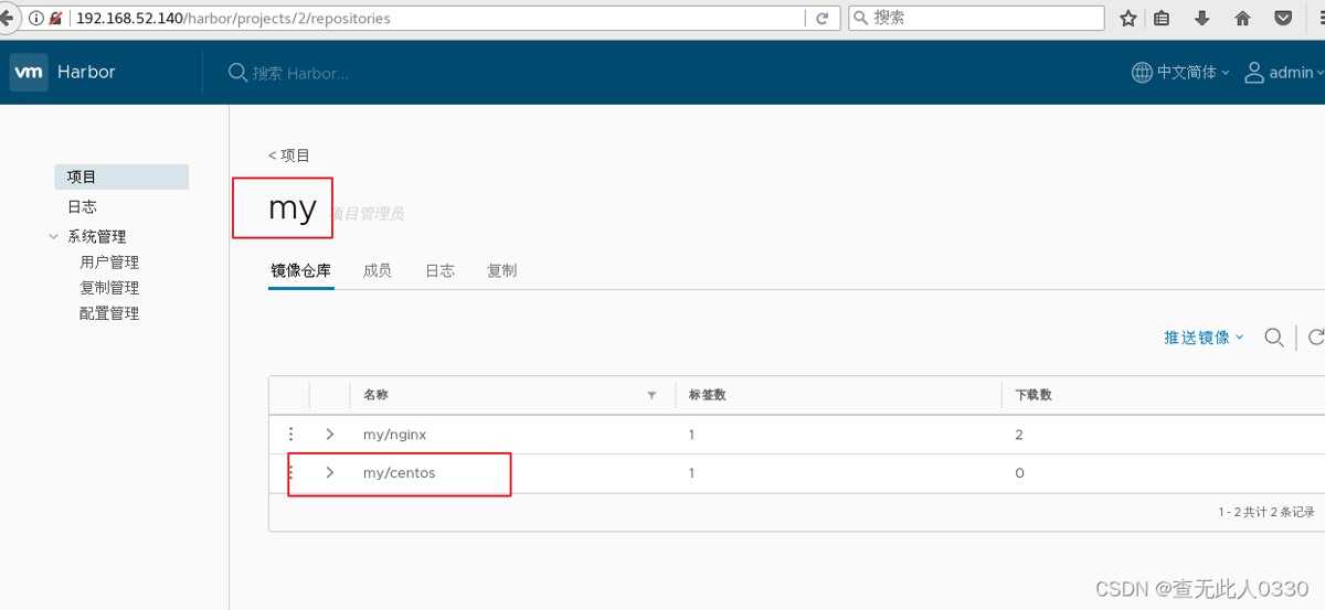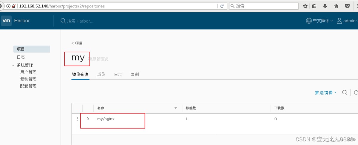 在 Harbor 界面 my 目录下可看见此镜像及相关信息