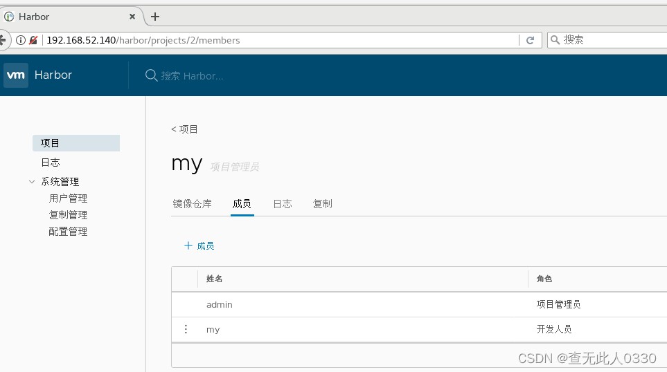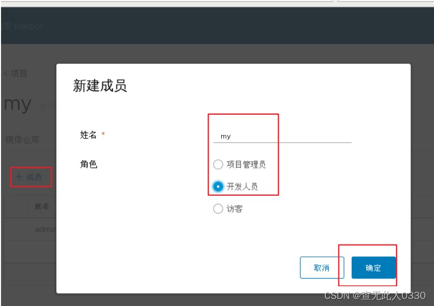 单击项目 ->my-> 成员 -> + 成员,填写上述创建的用户my并分配角色为“开发人员”。