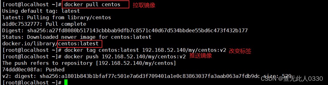 docker pull centos docker tag centos:latest 192.168.52.140/my/centos:v2 docker push 192.168.52.140/my/centos:v2