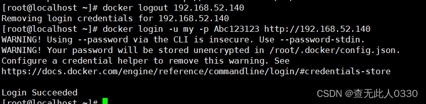 docker logout 192.168.52.140 docker login 192.168.52.140 或 docker login -u my -p Abc123123 http://192.168.52.140