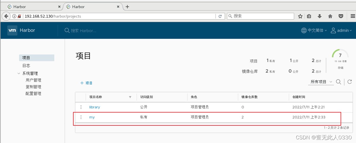 浏览器访问:http://192.168.52.130登录 Harbor WEB UI 界面