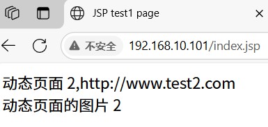##两台tomcat服务器配置一致 [root@localhost /]# dnf -y install java //安装实验需要的环境 [root@localhost /]# mkdir -p /web/webapp1 [root@localhost webapp1]# ls index.jsp ##第一台tomcat服务器 [root@localhost webapp1]# cat index.jsp <%@ page language="java" import="java.util.*" pageEncoding="UTF-8"%> <html> <head> <title>JSP test2 page</title> </head> <body> <% out.println("动态页面 1,http://www.test2.com");%> </body> <body> <div>动态页面的图片 1</div><br><img src="logo.png"> </body> </html> ##第二台tomcat服务器 [root@localhost webapp1]# cat index.jsp <%@ page language="java" import="java.util.*" pageEncoding="UTF-8"%> <html> <head> <title>JSP test2 page</title> </head> <body> <% out.println("动态页面 2,http://www.test2.com");%> </body> <body> <div>动态页面的图片 2</div><br><img src="logo.png"> ##为了方便验证两台服务器页面可以不一致 </body> </html>