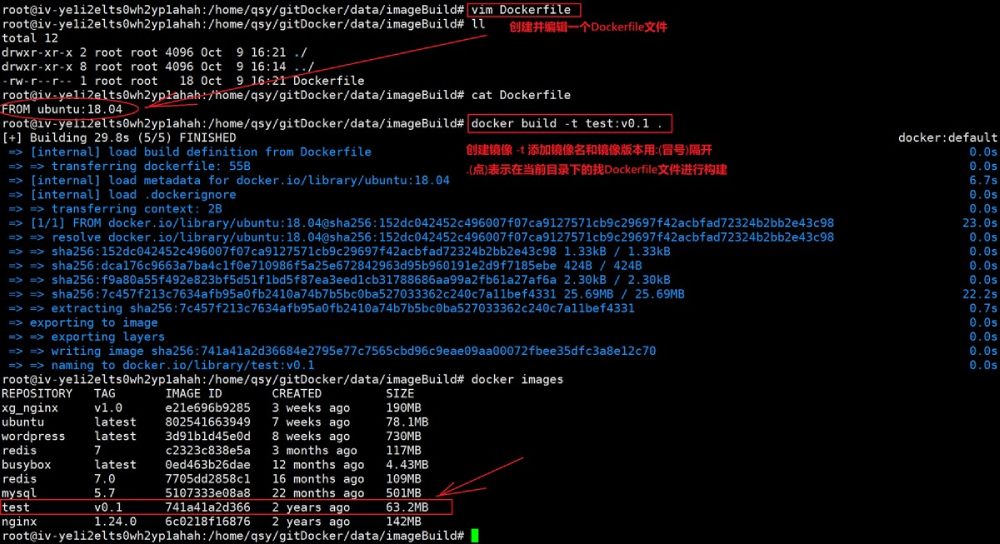 指令:基于运行中的容器手动创建镜像,这种方式操作简单但缺乏可重复性,镜像构建过程难以追溯和维护,不推荐用于生产环境。 - 使用Dockerfile文件:通过编写结构化的文本文件定义镜像构建步骤,支持版本控制、自动化构建和精确配置,能清晰记录镜像制作过程,便于团队协作与迭代优化,是推荐的标准做法。