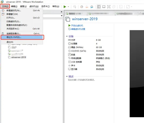 (2)点击vmware workstation的“文件”菜单,选择“导出OVF(E)...”设置保存路径,执行导出操作